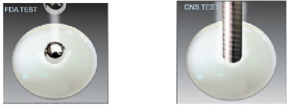 防撞防摔抗衝擊 HIGH IMPACT 鏡片通過以下二種撞擊試驗: 落球試驗: 依照美國FDA Impact resistant regulation 21 CFR 801.410規範,用16.3克的鋼珠(直徑16mm) 自127公分高處落下,擊中鏡片中心點最薄處。 最低強度試驗: 依照CNS 15067第6.5.1節規範,將鏡片置於55度C烤箱內1小時,再置於-5度C冰箱內1小時,再以100N(約10公斤)的圓頂鋼條下壓鏡片中心再薄處10秒鐘。